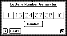 Lottery Number Generator 1.0 © 1997, Joel M. Sciamma, Inventors Emporium Freeware ![]() What does it do? This package generates six unique numbers selected randomly between the values 1 and 49 and sorts them in ascending order ready for entry onto your lottery form. It also allows changing of individual numbers by tapping them and pasting of sets of numbers at the caret. Installation The application is suitable for use on Newton 2.0 or later devices only. Install this package on internal or external stores using the Newton Backup Utility, Newton Package Installer or similar software. The package occupies just 6k of memory. It may be frozen when not in use. This application does not create any soups or prefs on your Newton. To completely remove it, just scrub out the Lottery icon in the Extras Drawer or select the icon and choose Delete from the routing menu. The downloads include the NTK source files for the package so you can examine how it has been built. If you do something interesting with the code to extend the package, I would appreciate hearing about it! |