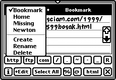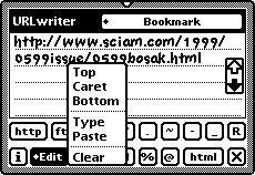 URLwriter 1.0 © 1997, Joel M. Sciamma, Inventors Emporium Free for existing users of ClipAssist 2.0, otherwise $16 US ![]() What does it do? Based on the same format as ClipAssist, URLwriter supports user-defined pages where URL's of all kinds can be captured very quickly by providing buttons that can enter the common components of a URL as a supplement to handwriting. Spaces are automatically suppressed. ![]() ![]() Installation The application is suitable for use on Newton 2.0 or later devices only. Install this package on internal or external stores using the Newton Backup Utility, Newton Package Installer or similar software. All other features are as for ClipAssist. (Thanks to Victor Rehorst for help with the format of the ZIP archive) |